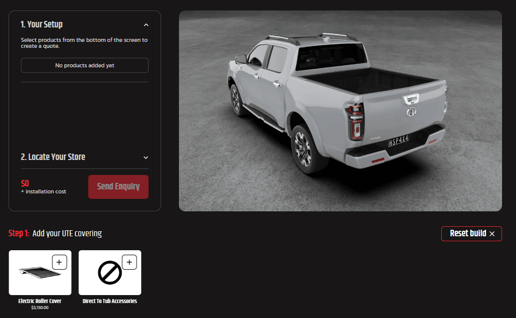Want to see how your vehicle looks with HSP Accessories? Head to our 3D builder to design your vehicle with HSP products and your factory sports bars. Plus, you can send an enquiry to your local HSP stockist with your complete build set-up!