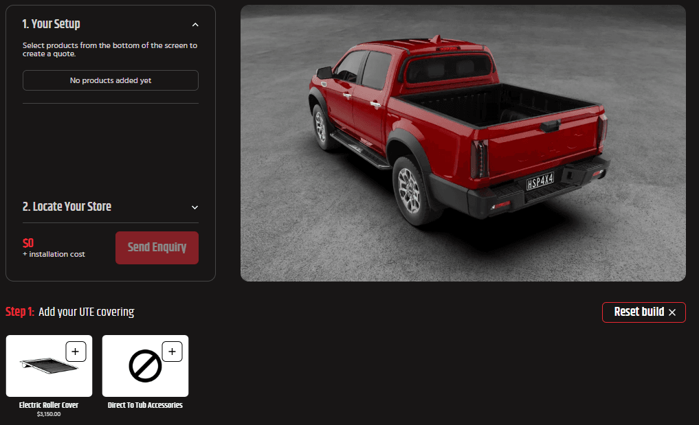Want to see how your vehicle looks with HSP Accessories? Head to our 3D builder to design your vehicle with HSP products and your factory sports bars. Plus, you can send an enquiry to your local HSP stockist with your complete build set-up!
