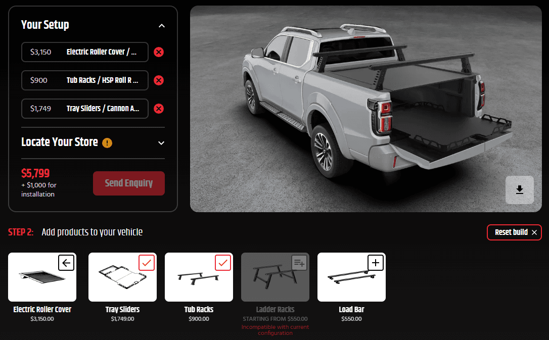 Want to see how your vehicle looks with HSP Accessories? Head to our 3D builder to design your vehicle with HSP products and your factory sports bars. Plus, you can send an enquiry to your local HSP stockist with your complete build set-up!