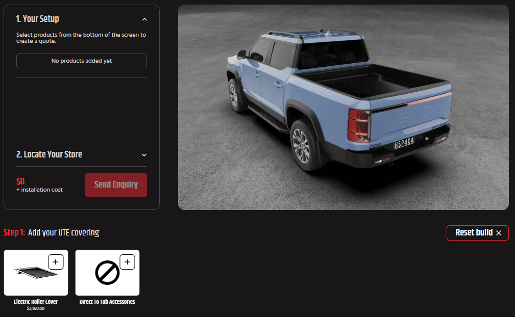 Want to see how your vehicle looks with HSP Accessories? Head to our 3D builder to design your vehicle with HSP products and your factory sports bars. Plus, you can send an enquiry to your local HSP stockist with your complete build set-up!