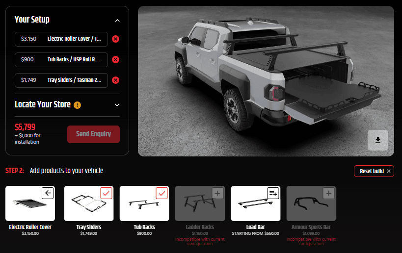 Want to see how your vehicle looks with HSP Accessories? Head to our 3D builder to design your vehicle with HSP products and your factory sports bars. Plus, you can send an enquiry to your local HSP stockist with your complete build set-up!