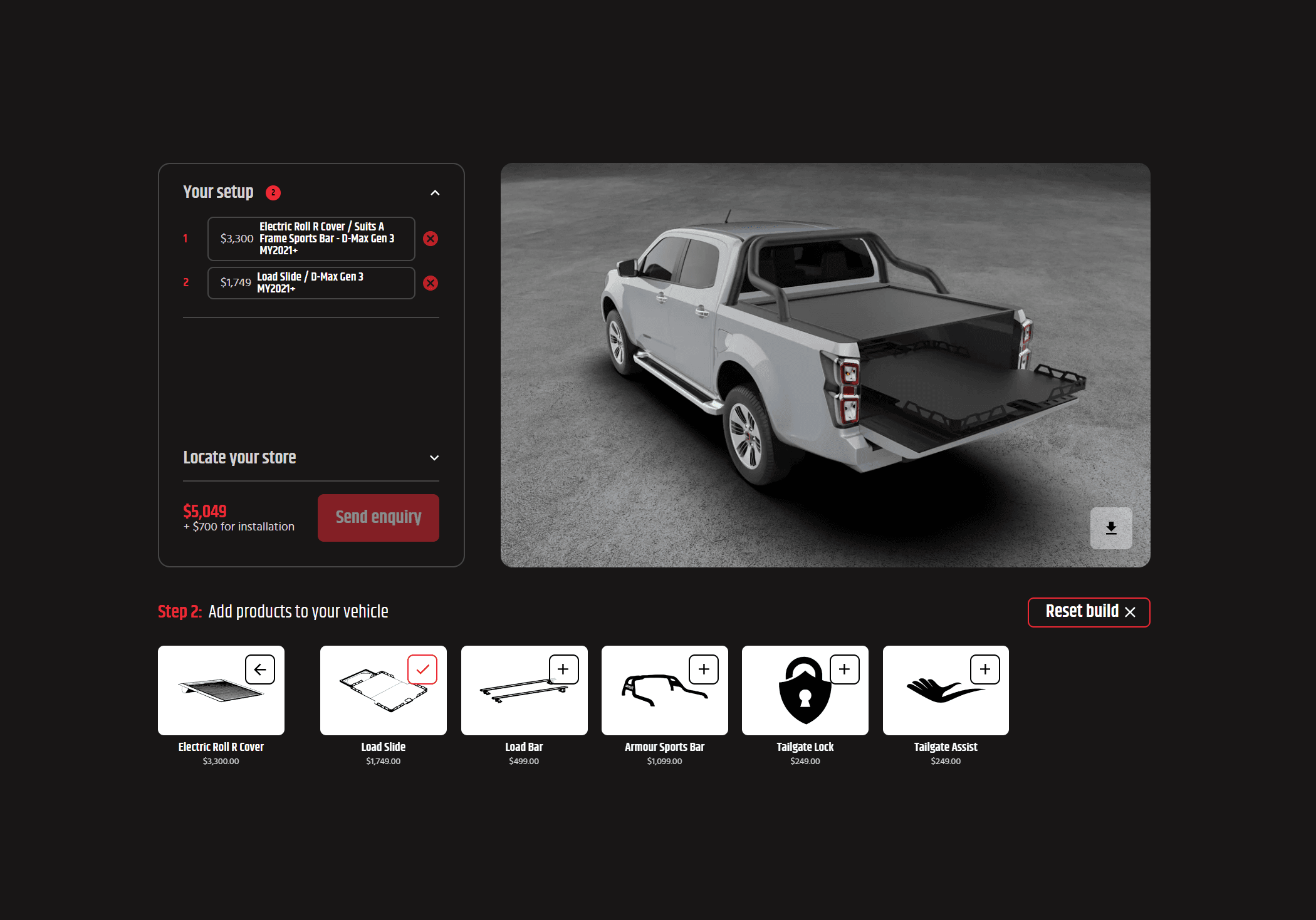 Want to see how your vehicle looks with HSP Accessories? Head to our 3D builder to design your vehicle with HSP products and your factory sports bars. Plus, you can send an enquiry to your local HSP stockist with your complete build set-up!