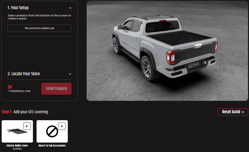 Want to see how your vehicle looks with HSP Accessories? Head to our 3D builder to design your vehicle with HSP products and your factory sports bars. Plus, you can send an enquiry to your local HSP stockist with your complete build set-up!