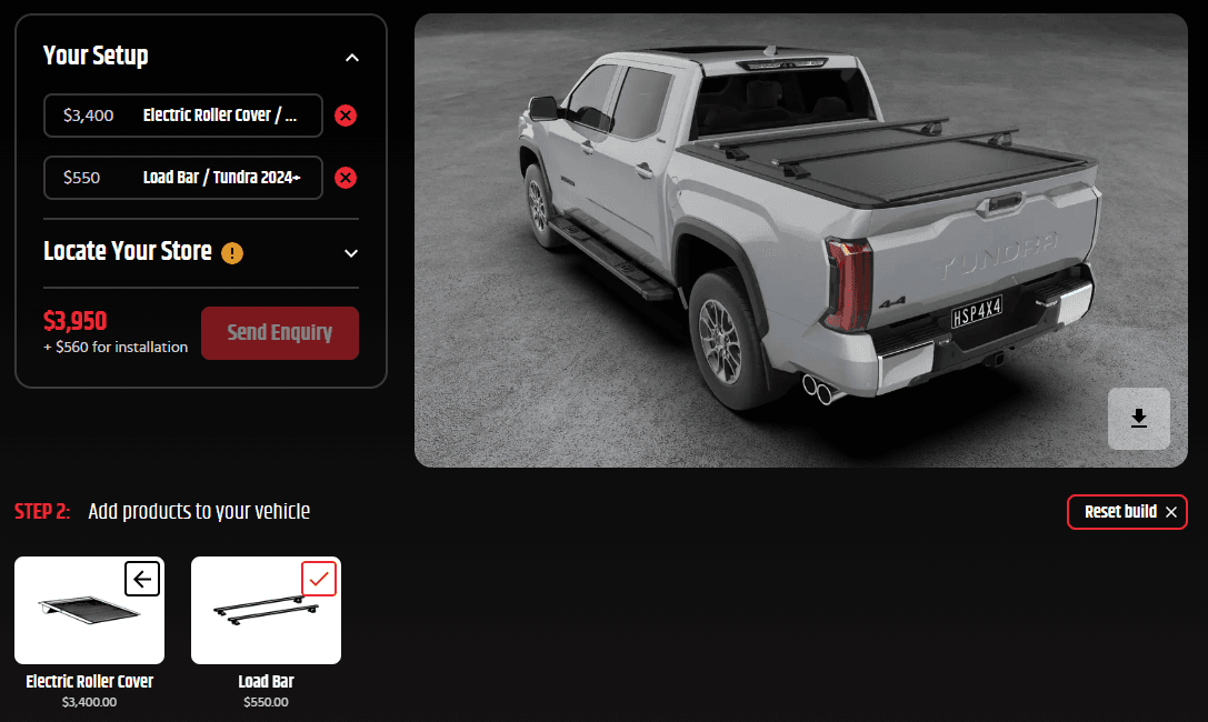 Want to see how your vehicle looks with HSP Accessories? Head to our 3D builder to design your vehicle with HSP products and your factory sports bars. Plus, you can send an enquiry to your local HSP stockist with your complete build set-up!