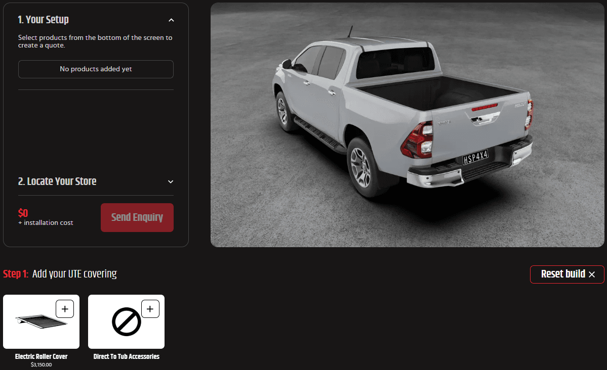 Want to see how your vehicle looks with HSP Accessories? Head to our 3D builder to design your vehicle with HSP products and your factory sports bars. Plus, you can send an enquiry to your local HSP stockist with your complete build set-up!